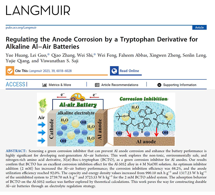 针对铝空气电池面临的上述问题,beat365郭雷教授课题组首先以锰基氧化物作为催化剂构建了高活性空气电极正极膜,继而以铝合金为负极,组装出携带循环电解液系统的铝空气全电池。从百余种有机物中筛选出了氨基酸衍生物、离子液体等十多种高活性分子作为电解液添加剂,探究了其对铝空气电池性能的影响。结果表明,通过此类分子在铝金属基底的多锚点吸附效应,自组装形成的界面阻挡膜能显著抑制铝阳极的析氢自腐蚀,明显改善了铝空气电池的放电性能,放电过程中铝离子均匀从铝电极表面剥离,铝阳极利用率、电池能量密度及比容量均大幅度提升,此种电解质调节策略为推进铝空气电池的商业化提供了技术支撑,同时也为铜仁市二氧化锰、四氧化三锰等锰系功能材料的拓展应用提供了新思路。