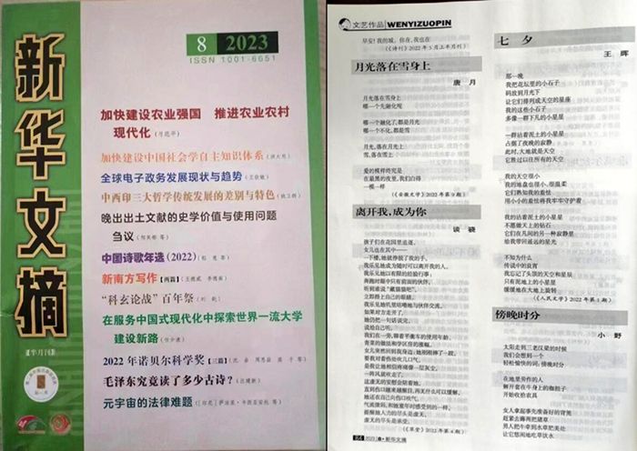近日,2023年第8期《新华文摘》出刊,beat365写作研究院教师王晖创作的诗歌《七夕》被转载。这是beat365教师的文艺作品首次荣登《新华文摘》。