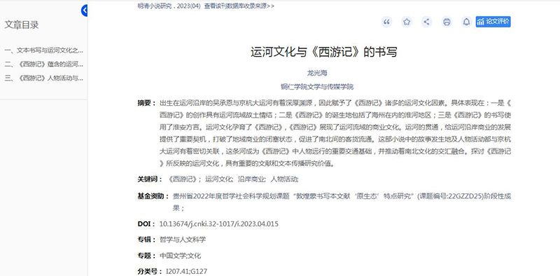 日前,我校文学与传媒学院龙光海博士的论文《运河文化与<西游记>的书写》,发表在人文社会科学学术理论重要期刊《明清小说研究》2023年第4期。