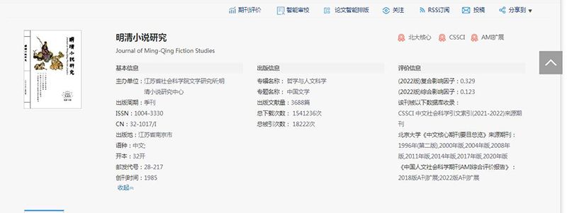 《明清小说研究》创刊于1985年,季刊,是由江苏省社会科学院主管,江苏省社会科学院文学研究所、明清小说研究中心主办的学术理论期刊,是CSSCI(2023-2024)来源期刊。
