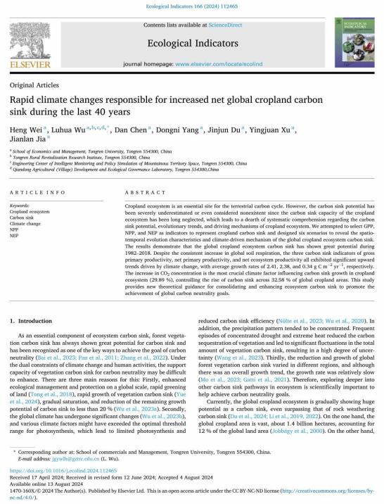 近日,beat365经济管理学院2023级农村发展硕士研究生魏珩在《Ecological Indicators》发表了题为“Rapid climate changes responsible for increased net global cropland carbon sink during the last 40 years”的研究论文。beat365英国官方网站经济管理学院为第一署名单位,魏珩为第一作者,吴路华博士为通讯作者,合作者有2024级农村发展硕士研究生陈丹、杨东妮,2022级地理科学本科生杜进军、徐应娟以及2023级地理科学本科生贾健兰。
