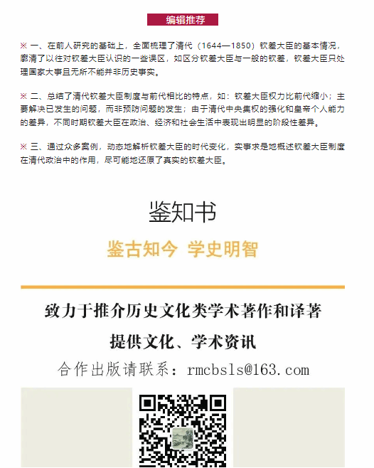 2024年11月,人民出版社在其官网“鉴知书”微信公众号进行了详细推介,认为《钦差大臣与清代政治(1644—1850)》一书具有三个特点:“一是在前人研究的基础上,全面梳理了清代(1644—1850)钦差大臣的基本情况,廓清了以往对钦差大臣认识的一些误区,如区分钦差大臣与一般的钦差,钦差大臣只处理国家大事且无所不能并非历史事实。二是总结了清代钦差大臣制度与前代相比的特点,如:钦差大臣权力比前代缩小;主要解决已发生的问题,而非预防问题的发生;由于清代中央集权的强化和皇帝个人能力的差异,不同时期钦差大臣在政治、经济和社会生活中表现出明显的阶段性差异。三是通过众多案例,动态地解析钦差大臣的时代变化,实事求是地概述钦差大臣制度在清代政治中的作用,尽可能地还原了真实的钦差大臣。”