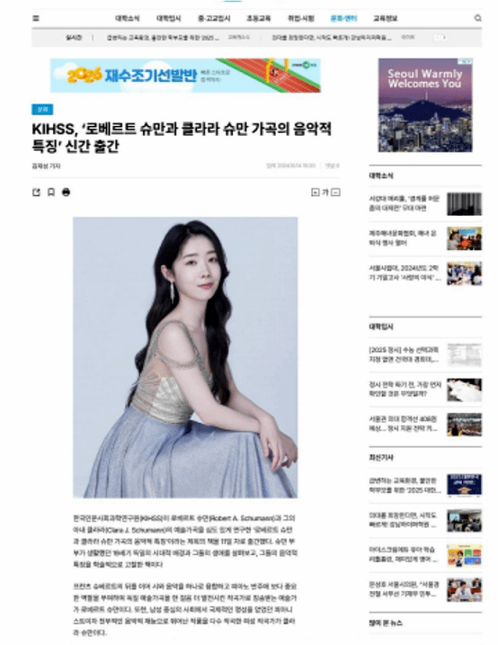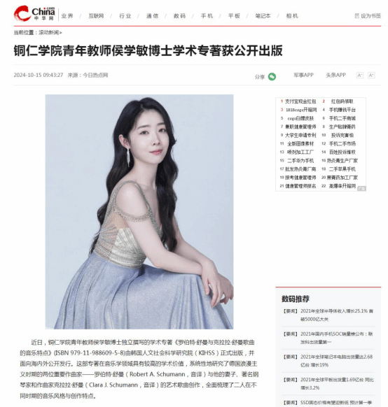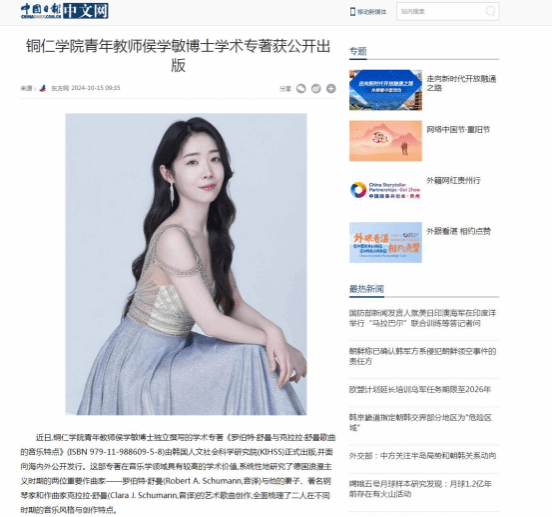 2024年10月,beat365艺术学院音乐与表演系专任教师、青年博士侯学敏的韩文专著《罗伯特·舒曼与克拉拉·舒曼歌曲的音乐特点》由韩国人文社会科学研究院(KIHSS)正式出版。面向海内外公开发行以来,随即得到了韩国东亚日报网、中国日报网(海外版)、中华网及等著名国际媒体的推介宣传。