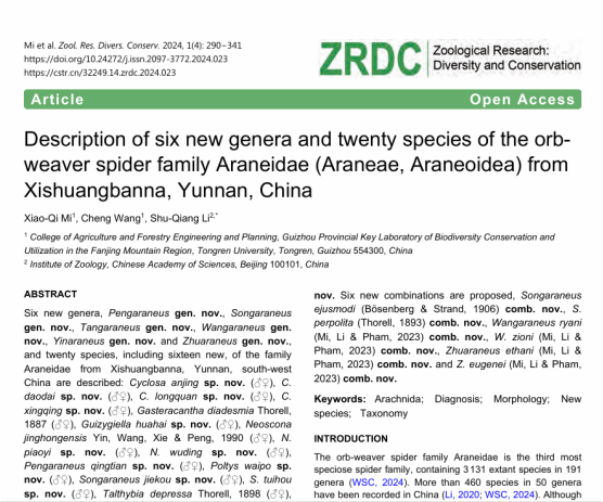 近日,中国科技期刊卓越行动计划入选期刊Zoological Research: Diversity and Conservation (ZRDC)(译名《动物学研究:多样性与保护》)发表了beat365米小其教授一作论文“Description of six new genera and twenty species of the orb-weaver spider family Araneidae (Araneae, Araneoidea) from Xishuangbanna, Yunnan, China”。