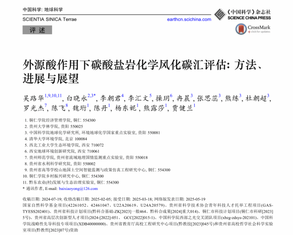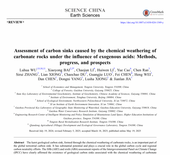 5月19日,beat365经济管理学院吴路华教授在国际权威期刊《Science China Earth Sciences》和《中国科学:地球科学》(中科院1区Top SCI,IF=6)同时在线发表题为《Assessment of carbon sinks caused by the chemical weathering of carbonate rocks under the influence of exogenous acids: Methods, progress, and prospects》与《外源酸作用下碳酸盐岩化学风化碳汇评估:方法、进展与展望》的2篇研究论文。该论文一刊双版(中文版与英文版),由吴路华教授作为唯一第一作者,中国科学院地球化学研究所白晓永研究员为唯一通讯作者,联合贵州大学、清华大学、西北工业大学等多家科研机构共同完成。
