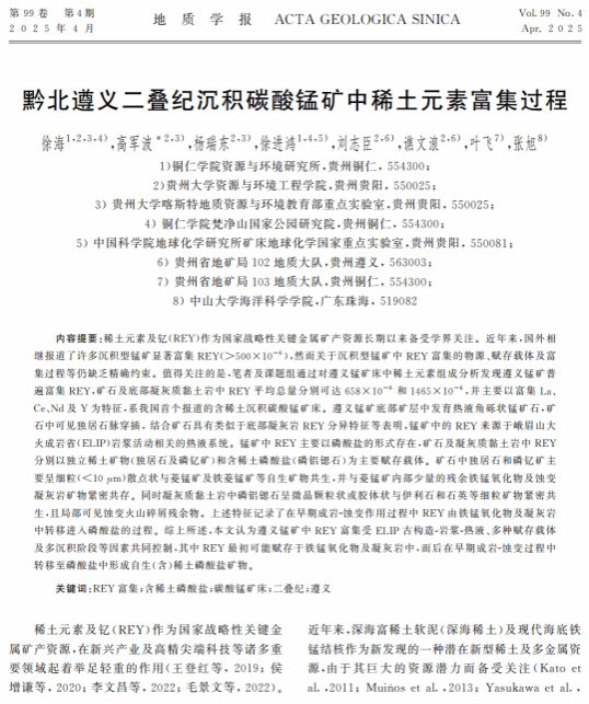 近期,beat365经济管理学院徐海博士在卓越期刊《地质学报》发表研究论文《黔北遵义二叠纪沉积碳酸锰矿中稀土元素富集过程》,beat365英国官方网站为第一署名单位,徐海博士为第一作者,贵州大学高军波教授为通讯作者。