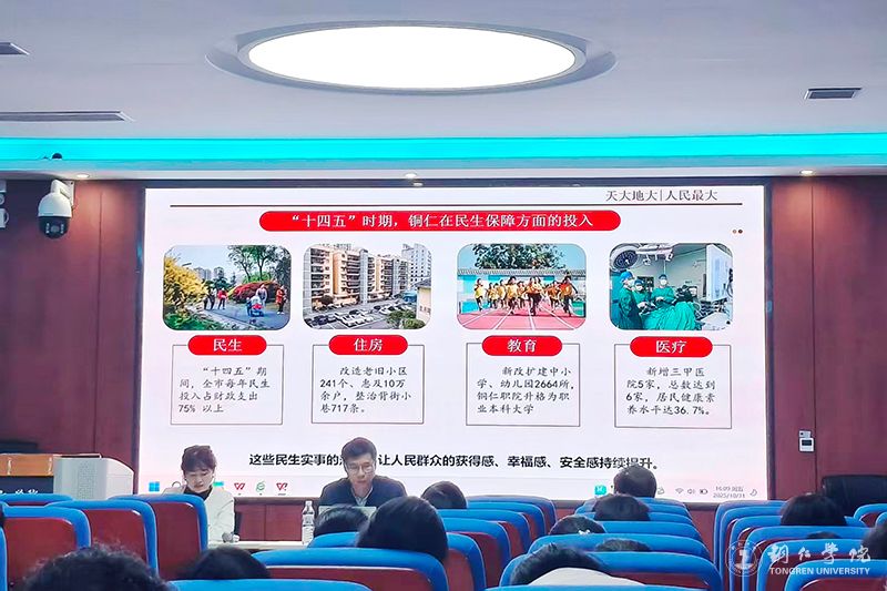 宣讲中,张佳佳与张熙钰两位老师配合默契、相得益彰,以“理论阐释+实践解读”的模式展开宣讲。宣讲伊始,张佳佳老师从“十四五”时期的铜仁的成就切入,结合党的二十大报告中“增进民生福祉,提高人民生活品质”的战略部署,系统解读了提高人民生活品质的主体力量、内驱动力与实践路径,强调高质量发展是保障民生的根本支撑,唯有立足发展实际、回应群众需求,才能让发展成果更多更公平惠及全体人民。张熙钰老师全程默契配合,补充案例细节、梳理优化逻辑。两位宣讲人一主一辅的讲解,生动诠释了“尽力而为”的责任担当与“量力而行”的科学态度。他们通过讲解身边看得见、摸得着的发展变化,让在场师生深刻感受到党的创新理论在实践中的强大生命力,也让大家明白,家事国事天下事,让人民过上幸福生活是头等大事。