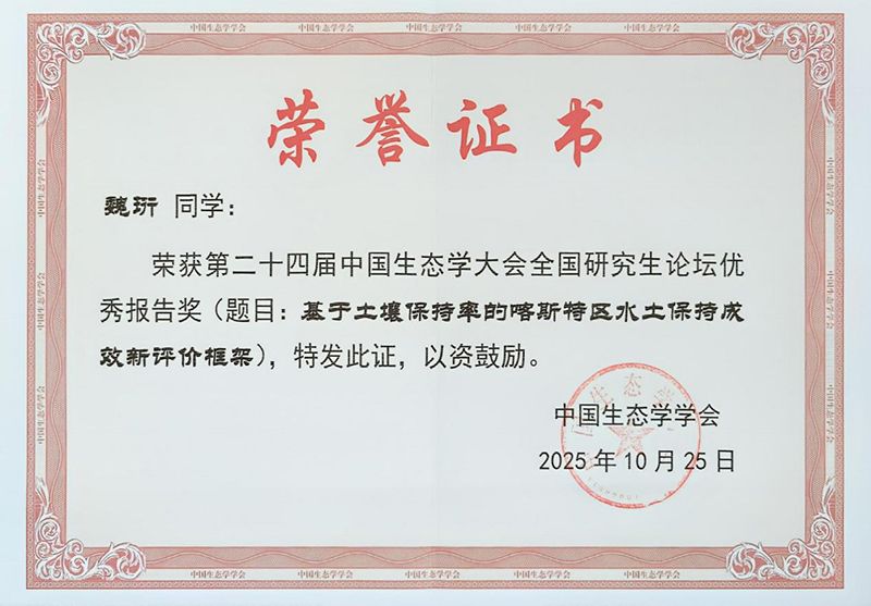 大会设立了全国生态学研究生论坛,来自清华大学、北京大学、复旦大学、中国科学院大学等高校与科研机构的490余位研究生在15个分会场作专题报告。魏珩在第4分会场“草地与荒漠生态系统对环境变化的响应”,以《全球气候变化及其对喀斯特植被碳汇过程的影响》为题作报告。其汇报内容理论创新性强、数据分析严谨,深入揭示了气候变化背景下喀斯特生态系统碳汇格局演变特征与气候驱动机制,并提出了基于土壤保持率的喀斯特区水土保持成效新评价体系。