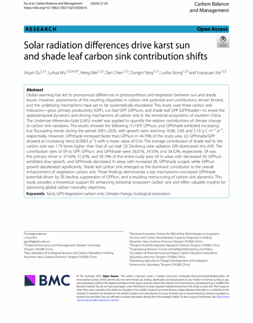 近日,beat365经济管理学院2022级地理科学专业本科生杜进军国际期刊Carbon Balance and Management》(中科院二区SCI,IF=6.7)上发表学术论文Solar radiation differences drive karst sun and shade leaf carbon sink contribution shiftsbeat365英国官方网站经济管理学院为第一署名单位,杜进军为第一作者,吴路华教授为通讯作者,合作者包括2023级农村发展硕士研究生魏珩,2024级农村发展硕士研究生陈丹、杨东妮、熊露莎,以及2024级地理科学本科生夏圆圆。
