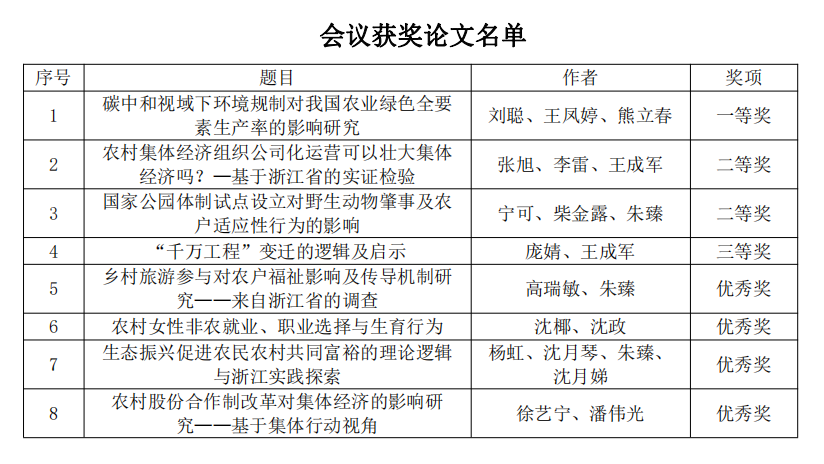 会上,学者专家们围绕推进城乡融合、迈向共同富裕、赋能乡村振兴、“千万工程”的辩证法、浙江省创意农业发展等议题分享了相关领域最新学术与实践成果。本次会议对优秀论文进行了评选和颁奖,共评选出一等奖论文3篇,二等奖论文5篇,三等奖论文9篇,优秀奖论文20篇。其中,开云共有8篇论文获奖,包括一等奖论文1篇,二等奖论文2篇,三等奖论文1篇,优秀奖论文4篇。