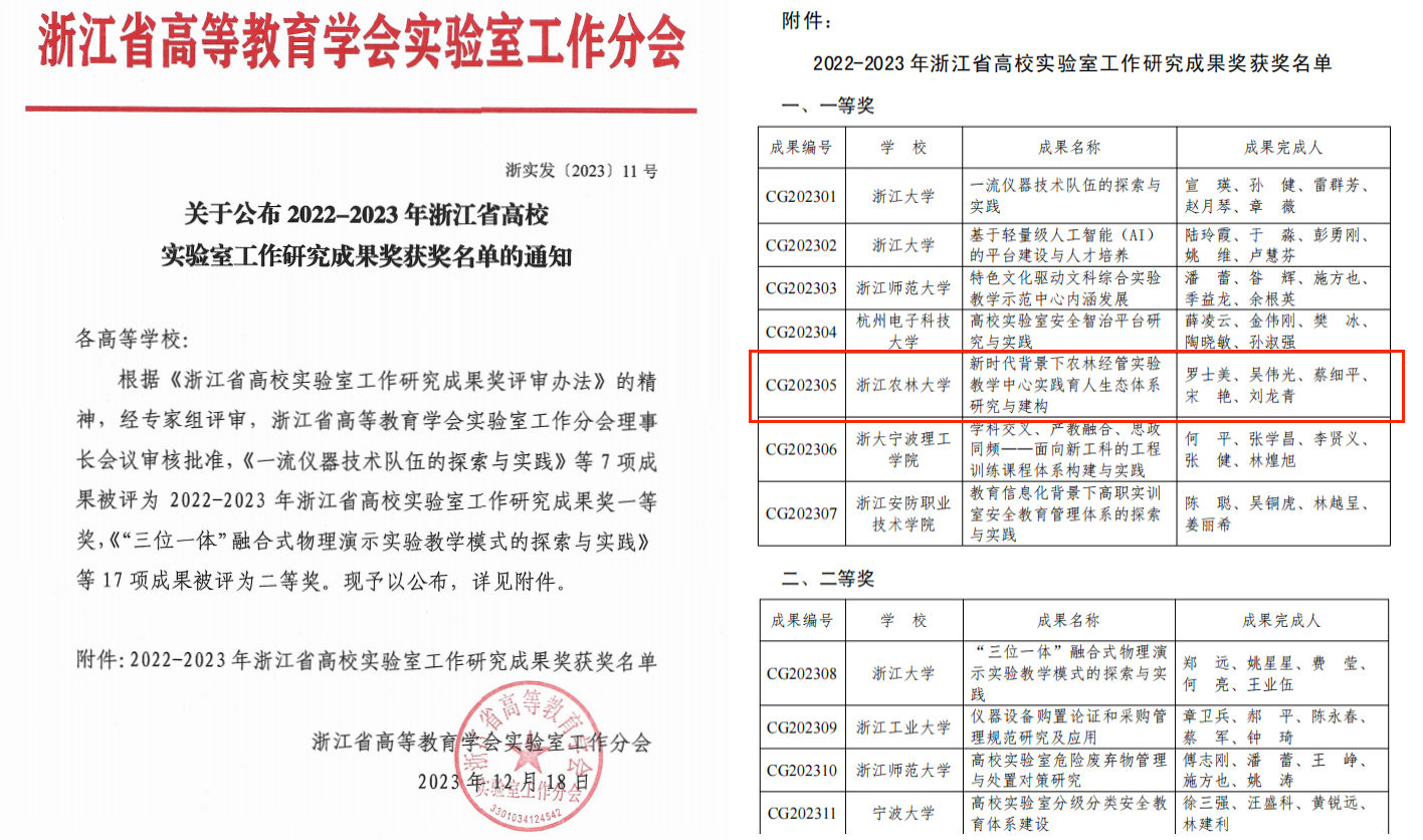 近日,据浙江省高等教育学会实验室工作分会发布《关于公布2022-2023年浙江省高校实验室工作研究成果奖获奖名单的通知》获悉,由开云实验中心罗士美老师主持的“新时代背景下农林经管实验教学中心实践育人生态体系研究与建构”成果获得一等奖。本次全省高校实验室工作研究成果奖评比,共评出一等奖7项、二等奖17项。