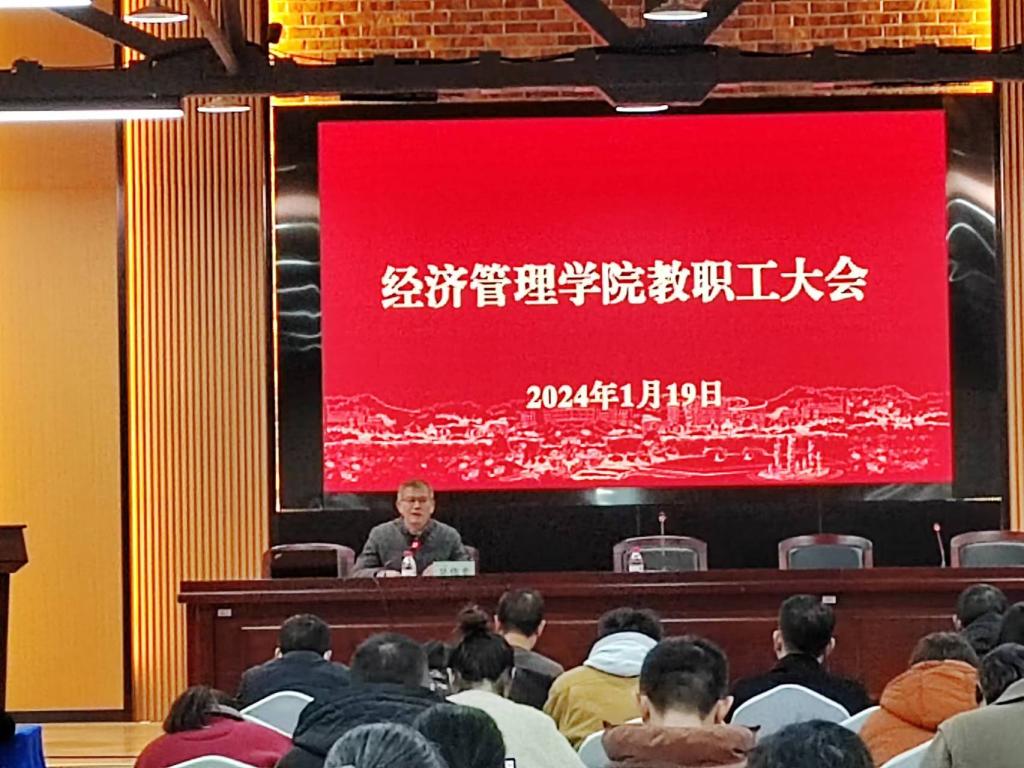 吴伟光院长作了学院2023年度工作报告。他全面总结了2023年学院发展取得的成绩,并提出了2024年主要努力方向。他指出,2023年学院工作成绩突出,亮点纷呈,实现了许多重大突破。他从队伍建设、专业建设与育人理念、平台建设、标志性成果的培育、组织化工作、青年教师的成长等六个方面对2024年工作提出了要求,希望全体教师要脚踏实地,目标高远,深入贯彻研究型学院的建设要求,全力做好教育教学审核评估工作,努力提高学院国际化水平和创收能力,守牢底线,创新发展,以更好的成绩为学校战略部署贡献经管力量。吴伟光代表学院对新进教职工表示热烈欢迎,希望各位新进教职工尽快完成角色转换,既要满怀自信,又要虚心求教。