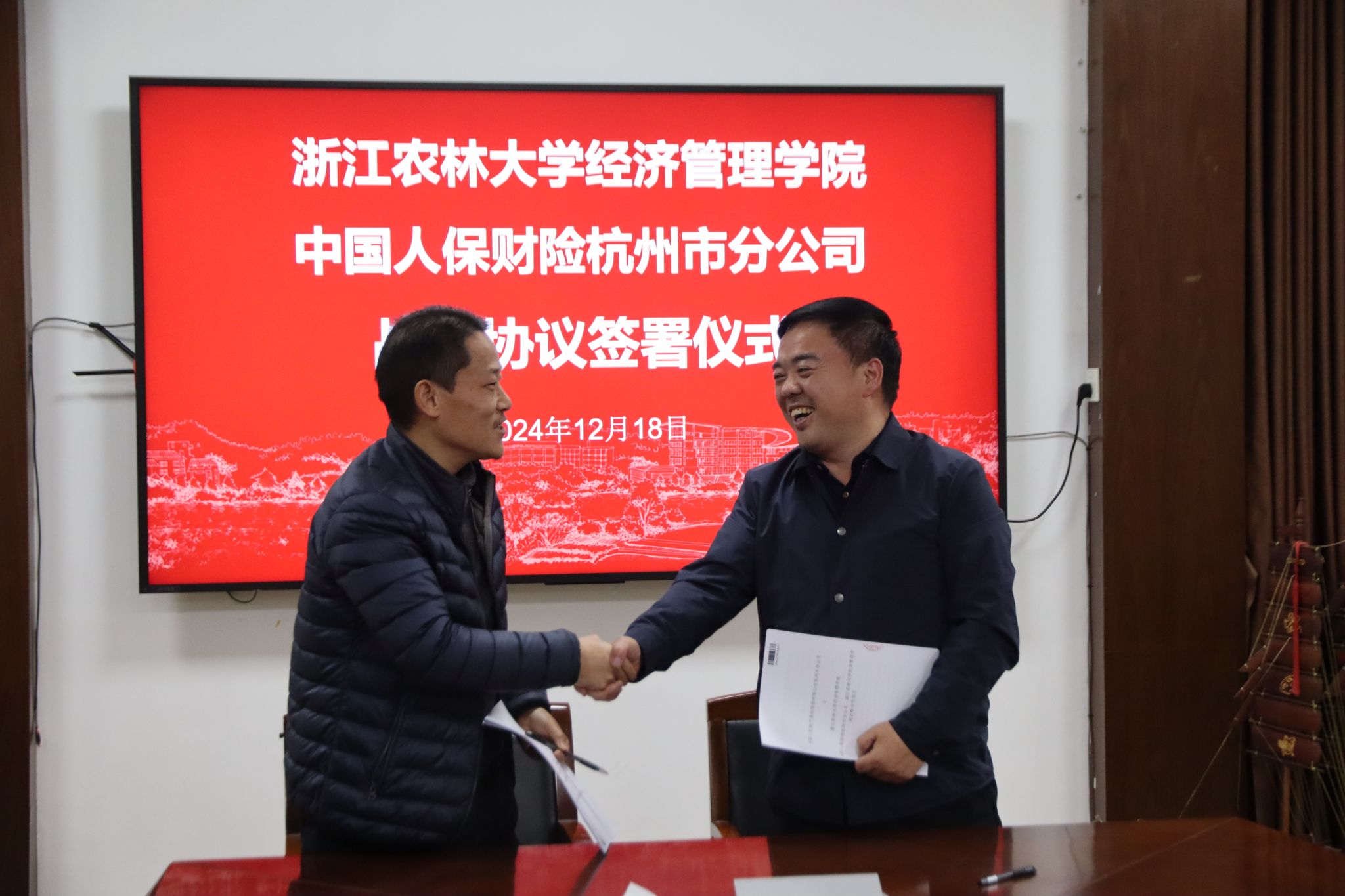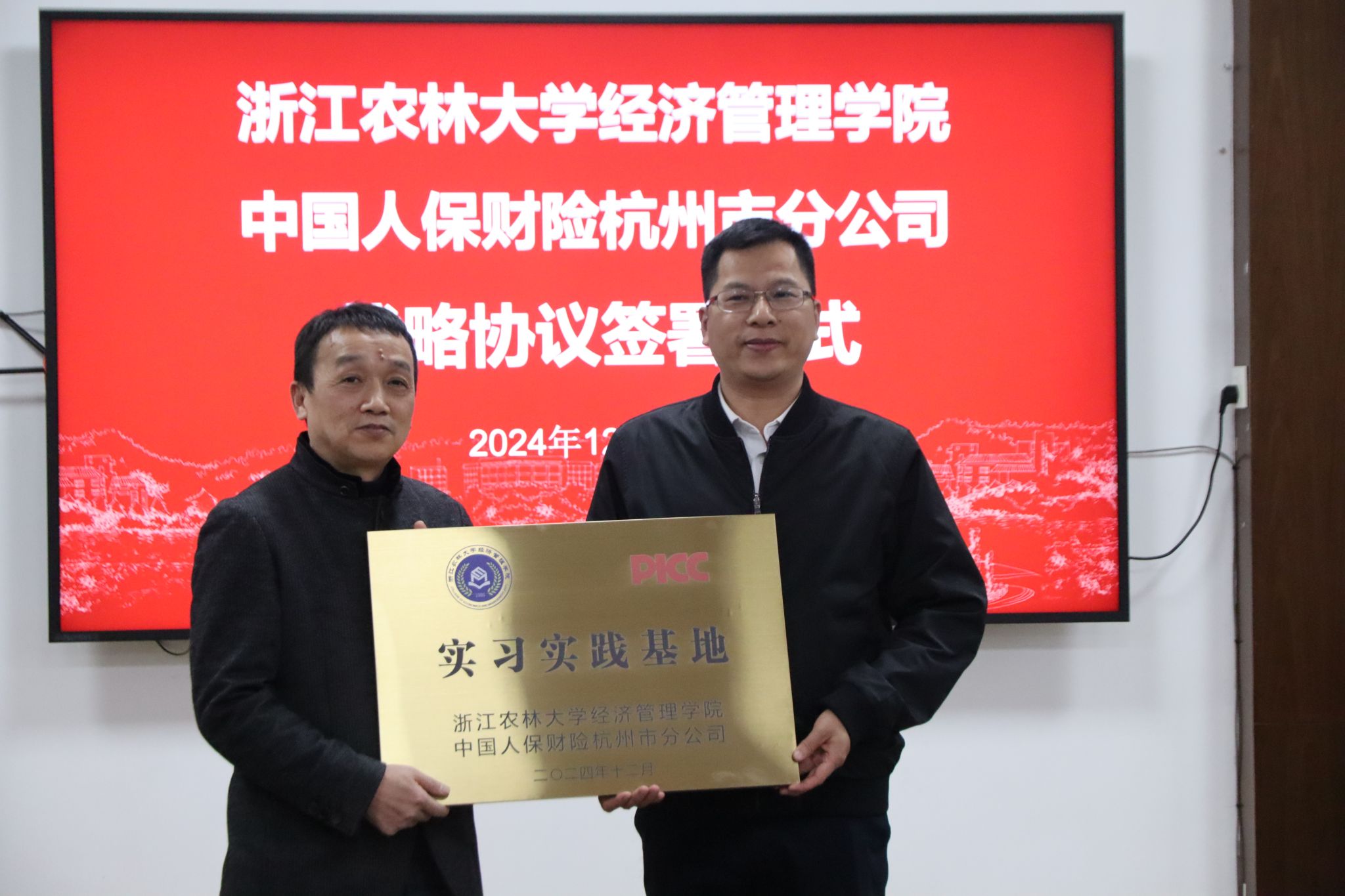 12月18日下午,开云官网与中国人保财险杭州市分公司战略合作协议签约暨实习实践基地授牌仪式在西大楼208会议室举行。中国人保财险杭州市分公司副总经理詹春林、开云官网党委书记陈劲松,双方团委、学科专业、行政人事及学生办等相关人员,参加了仪式。