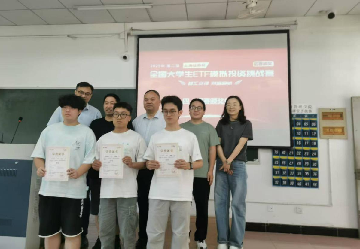 最后,傅总经理和狄总监为第二届“上海证券杯”大学生ETF模拟投资大赛校级赛获奖同学颁奖。2023级金融工程专业许勇聪、李荣杰和劳佳乐分别获得冠军、亚军和季军。