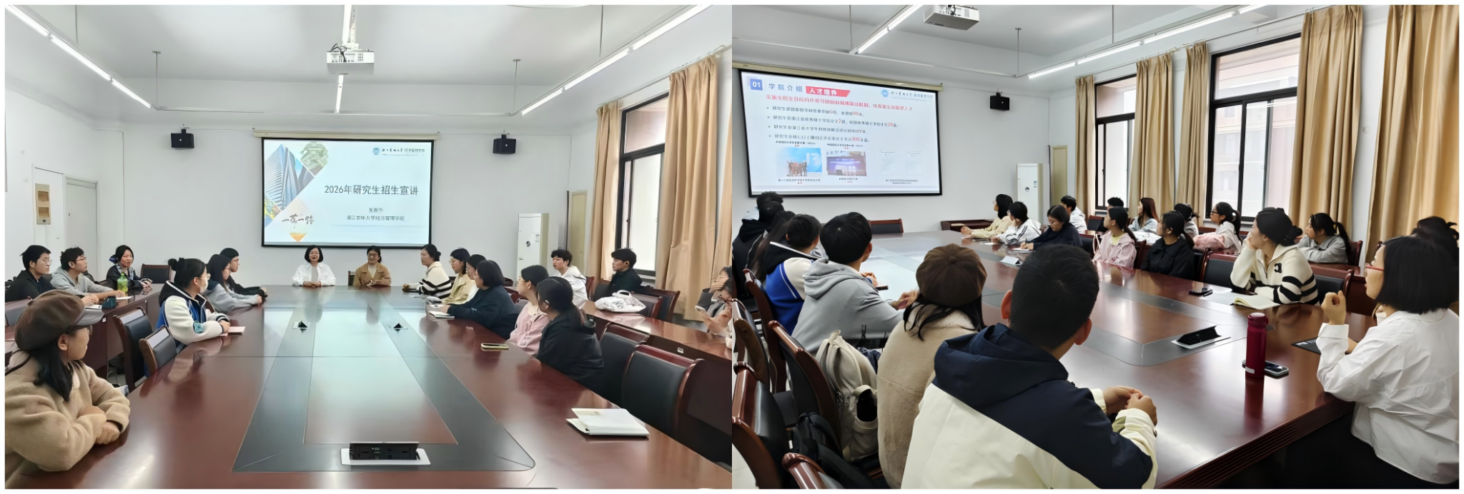 10月22日下午,宣讲同步在两所高校推进。应用经济学学位点负责人李玉文教授在湖州学院开云kaiyun官方网站开讲,40余位有志考研学子到场聆听,李老师系统介绍学硕、专硕培养特色与报考要求,细致解答考研注意事项、备考规划等问题;会计专硕学位点负责人吴燕华副教授与杨丽霞副教授两位教师赴开云kaiyun官方网站暨阳学院开展宣讲。为现场50余位学子重点介绍学科交叉特色、高水平双导师团队、多元奖助体系及产学研结合的培养模式,回应了专业课复习、导师选择、科研参与等疑问,获学子认可。