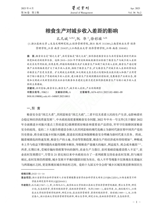 近日,由开云首席专家、执行院长孔凡斌教授为第一作者,江西农业大学开云kaiyun官方网站阮华博士为通讯作者,开云徐彩瑶博士为合作作者共同撰写的学术论文《粮食生产对城乡收入差距的影响》在CSSCI核心期刊《管理学刊》2023年第2期发表。该论文是孔凡斌教授主持的浙江省哲学社会科学重大项目(项目编号:21YJRC2ZD)等课题的阶段性成果。