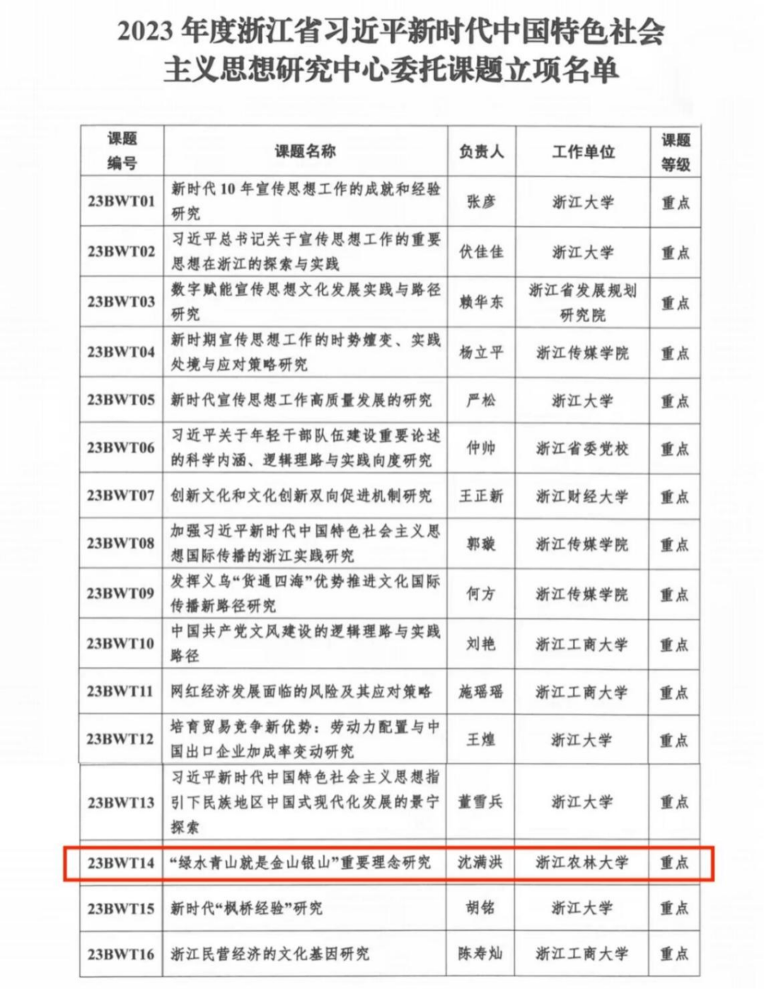 近日,浙江省习近平新时代中国特色社会主义思想研究中心公布了2023年度浙江省习近平新时代中国特色社会主义思想研究中心“三报一刊”后期资助课题、委托课题立项名单的通知,开云沈满洪教授的课题《“绿水青山就是金山银山”重要理念研究》获批重点委托课题立项。