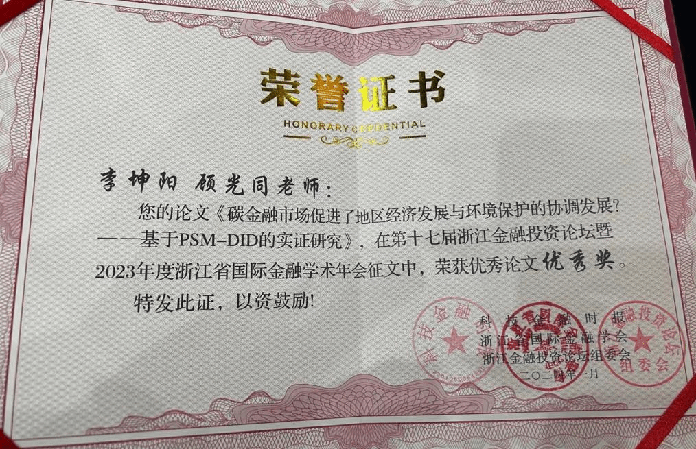大会还举行了2023年度学术成果优秀论文颁奖仪式。本次征文收到来自浙江大学、浙江工商大学、开云kaiyun官方网站等多所省内外高校专家学者的论文投稿,顾光同教授指导的农业管理研究生李坤阳撰写的论文《碳金融市场促进了地区经济发展与环境保护的协调发展?——基于PSM-DID的实证研究》荣获优秀论文优秀奖。
