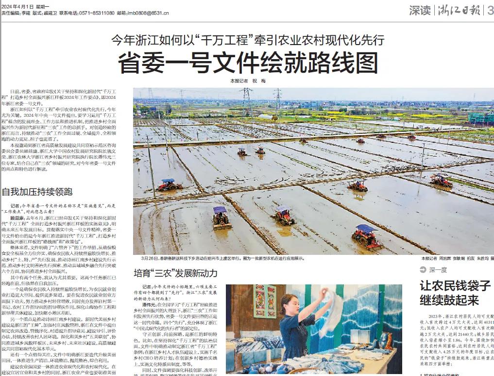 日前,省委、省政府印发《关于坚持和深化新时代“千万工程”打造乡村全面振兴浙江样板2024年工作要点》,即2024年浙江省委一号文件。《浙江日报》邀请到浙江省高质量发展建设共同富裕示范区咨询委员会委员顾益康,浙江大学中国农村发展研究院院长钱文荣,学院潘伟光教授三位专家,结合自己在“三农”领域的研究,对今年省委一号文件的亮点和特色进行解读。解读文章在《浙江日报》4月1日《今年浙江如何以“千万工程”牵引农业农村现代化先行 省委一号文件绘就路线图》第3版整版刊出,并在《潮新闻》全文刊出。