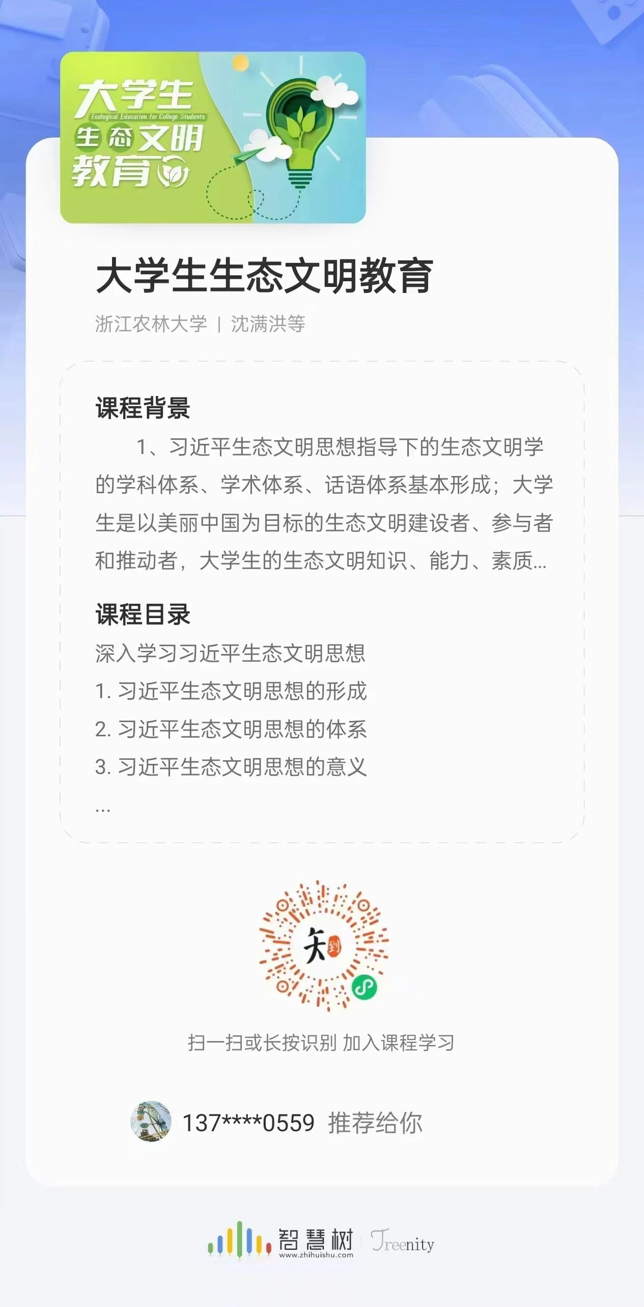 《大学生生态文明教育》是面向全校本科生开设的通识选修课程,是人文学科、社会科学和自然科学交叉的通识类课程。本课程旨在以习近平生态文明思想为指导,综合运用经济学、管理学、生态学、伦理学、法学、环境科学、历史、文化等跨学科知识,让广大学子掌握学习习近平生态文明思想的理论体系和重要意义、生态文明思想的基本立场和根本理念、生态文明思想的基本知识和重要专题以及生态文明思想的实践路径和重要方法。
