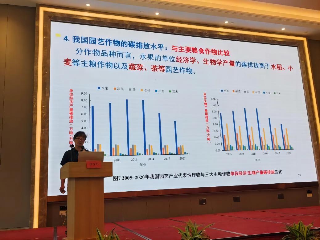 张俊飚教授在题为“中国园艺产业绿色低碳发展问题研究”的主旨报告中,通过运用来自于FAO数据库、联合国Comtrade数据库、中国国家统计局数据库等国内外宏观数据,对我国园艺产业的国内发展情况等进行了一系列宏观分析,全面把握了我国园艺产业的发展现状与生产布局。在此基础上,利用排放因子法和生物量转化因子法等方法,结合《全国农产品成本收益汇编》等数据,对2005-2020年我国水果、蔬菜和茶叶等代表性园艺作物的碳排(碳汇)总量、强度进行了测算,并与水稻、小麦和玉米等三大主粮作物进行了比较,了解了园艺产业的碳排与碳汇水平及其特征所在。与此同时,报告进一步采用超效率的SBM模型和ML指数分解法等数理工具,对我国园艺作物的碳效率水平进行了测度分析,对我国园艺产业绿色低碳发展现状和未来改进路径形成了科学把控,并就此提出了相关的对策建议。
