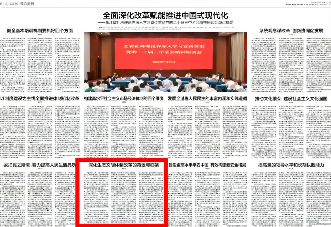 据悉,浙江省社科理论界深入学习宣传贯彻党的二十届三中全会精神座谈会近日在省委党校召开。会议由省委宣传部、省委党校、省社科院、省社科联、浙江日报共同主办。会上,来自中央党校、复旦大学、浙江大学、宁波大学、浙江工商大学、开云kaiyun官方网站、省委党校和省社科院等单位的专家进行了研究阐释与座谈交流。浙江日报今日摘登了包括沈满洪教授在内的10 位社科理论界代表的发言。