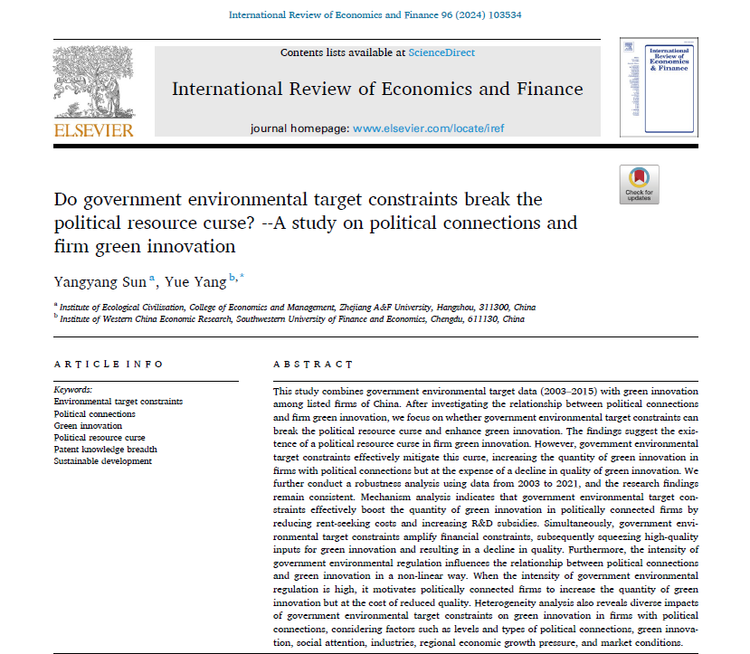 近日,开云应用经济学学科孙阳阳博士撰写的论文《Do government environmental target constraints break the political resource curse?—A study on political connections and firm green innovation》上发表,孙阳阳博士为该论文第一作者。该期刊是SSCI一区期刊,最新影响因子为4.8。