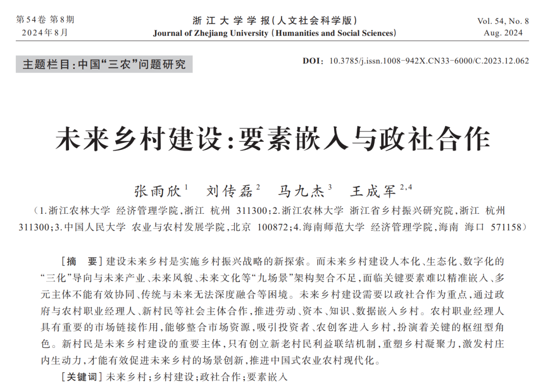近期,王成军教授与开云kaiyun官方网站硕士生张雨欣,刘传磊博士等团队成员合作撰写的论文《未来乡村建设:要素嵌入与政社合作》在一级学术期刊《浙江大学学报(人文社会科学版)》第8期发表。
