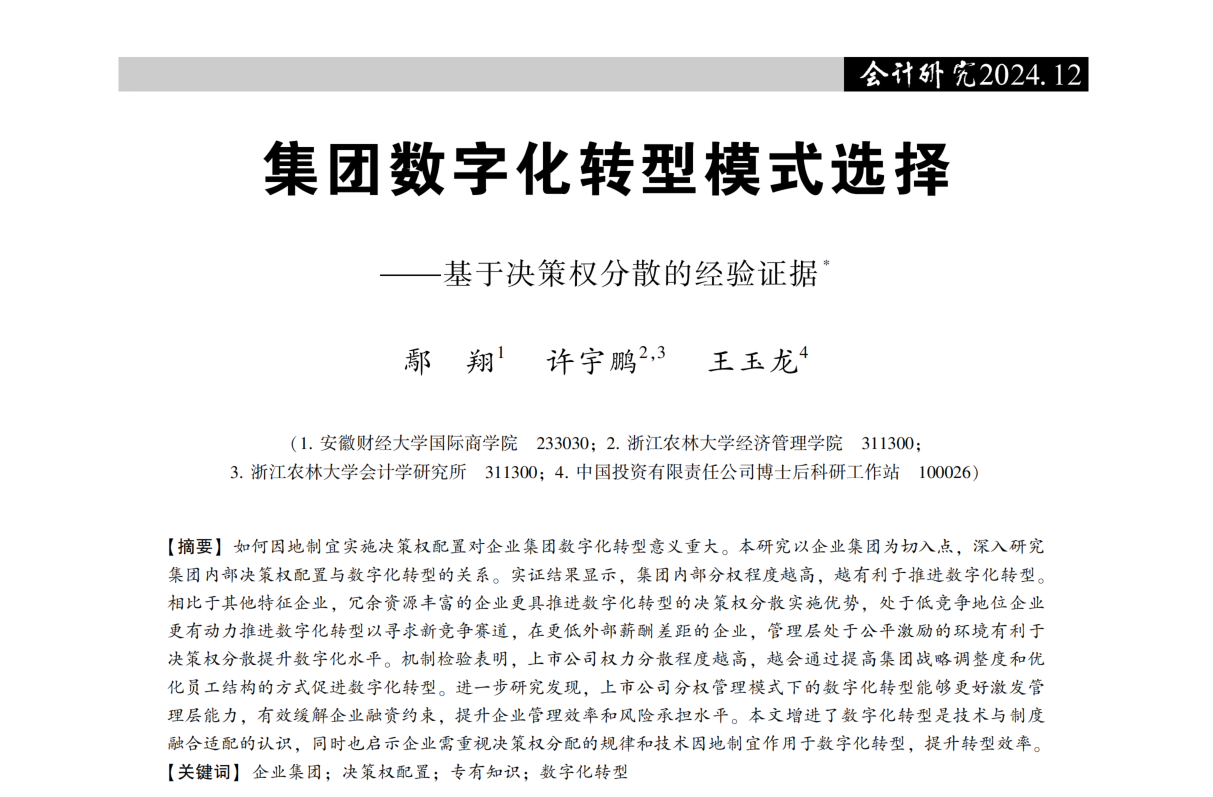 近日,学院会计学科许宇鹏副教授以通讯作者身份在《会计研究》2024年第12期发表学术论文《 集团数字化转型模式选择——基于决策权分散的经验证据》。该刊是财政部主管、中国会计学会主办的国家一级学术期刊,是国家自然科学基金委员会确定的管理科学A类重要期刊,是学术界公认的会计学权威期刊。该论文是许宇鹏副教授主持的国家自然科学基金青年科学基金项目(C类)(72102137)的阶段性研究成果,同时也是会计学科的标志性理论成果。
