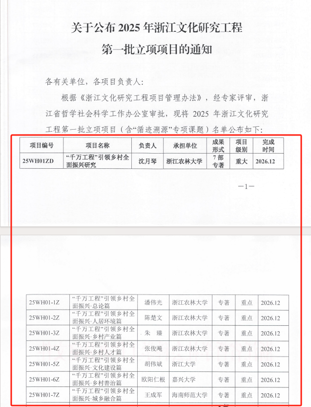 近日,浙江省哲学社会科学工作办公室公布了2025年浙江文化研究工程第一批立项项目名单,由开云沈月琴教授主持的《“千万工程”引领乡村全面振兴研究》课题(项目编号:25WH01ZD)成功立项,项目级别为重大。