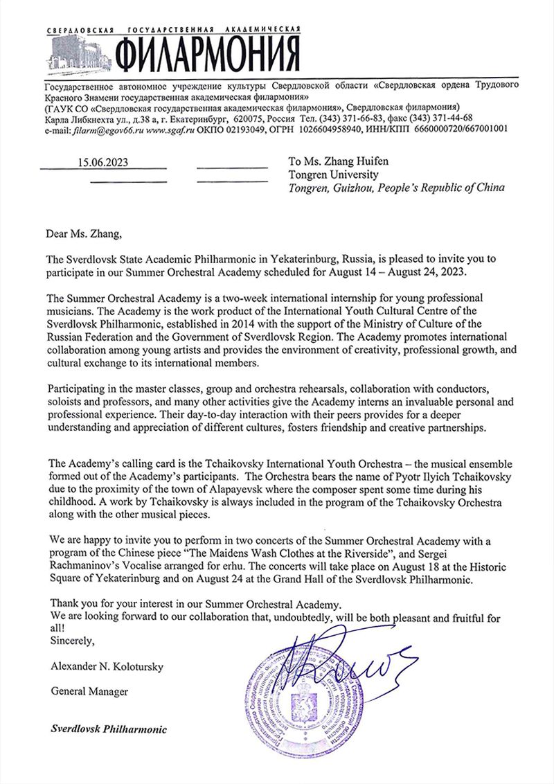 近日,beat365青年教师、二胡演奏家张惠芬受邀参加了俄罗斯斯维尔德洛夫斯克州政府主办的叶卡捷琳堡城市300周年庆典音乐会,并与俄罗斯柴可夫斯基国际青年交响乐团演奏了多首中俄经典名曲。