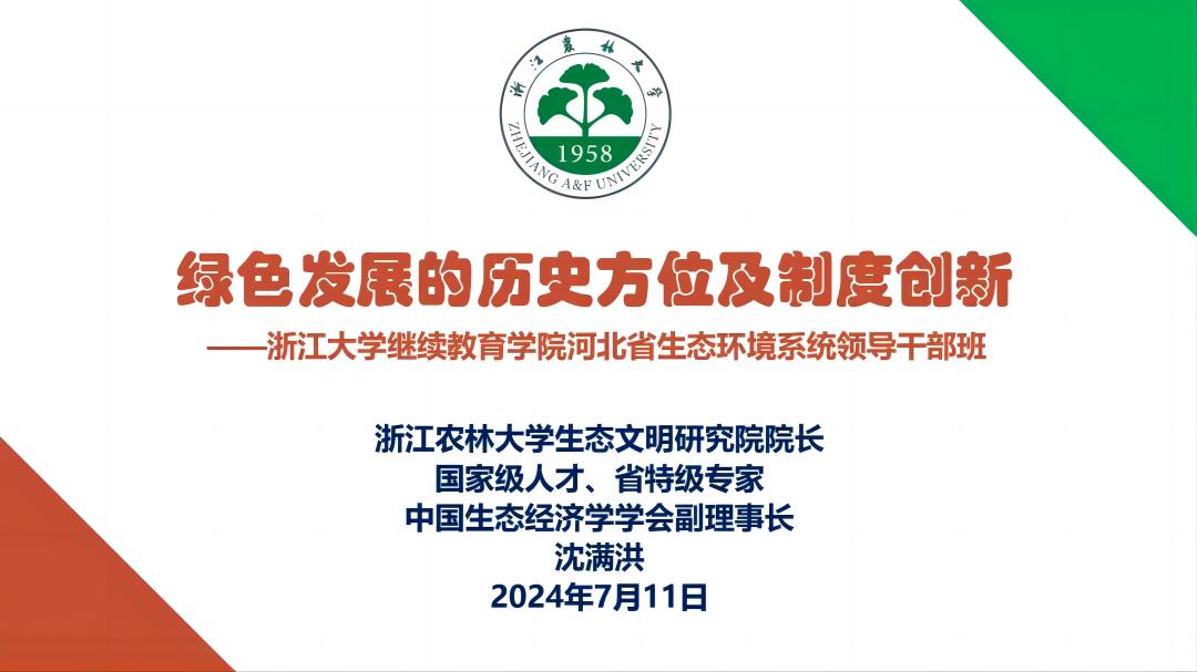 河北省生态环境系统领导干部学习习近平生态文明思想专题培训班于2024年7月上中旬在浙江大学举行,浙江大学继续教育学院承办本次系列培训。2024年7月11日上午,沈满洪教授为培训班的71位学员讲授了题为《绿色发展的历史方位及制度创新》的专题。