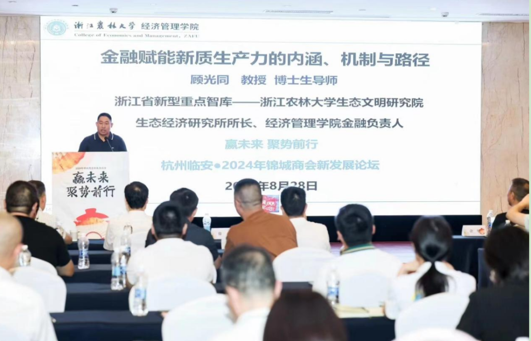 由锦城街道商会主办的“赢未来 聚势前行——2024年锦城商会新发展论坛”于2024年8月28日在杭州临安举办。顾光同教授应邀作《金融赋能新质生产力的内涵、机制与路径》的大会主旨报告。