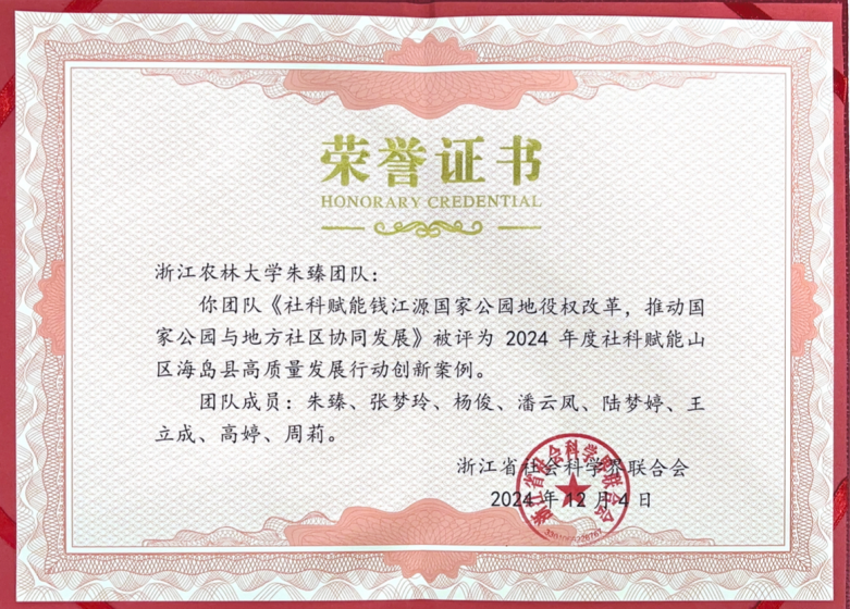 近日,浙江省2024年社科赋能山区海岛高质量发展行动工作推进会在武义县召开,学院副院长朱臻教授的团队研究成果《社科赋能钱江源国家公园地役权改革,推动国家公园与社区协同发展》被评为“2024年度社科赋能山区海岛县高质量发展行动创新案例”,并受到省社科联的通报表扬。该成果在开展国家公园管理部门访谈与大样本社区农户调查基础上,全面系统总结了钱江源国家公园地役权改革这一体制机制创新所取得的重要效果,分析了目前存在的问题与挑战,优化了未来地役权扩面改革补偿方案,并提出了相关政策保障,为钱江源国家公园农田地役权扩面改革的顺利推进“保驾护航”,也为国家公园与地方社区协同发展提供了决策依据。这是学院响应省社科联社科赋能山区海岛县,积极服务地方高质量发展的又一重要创新成果。