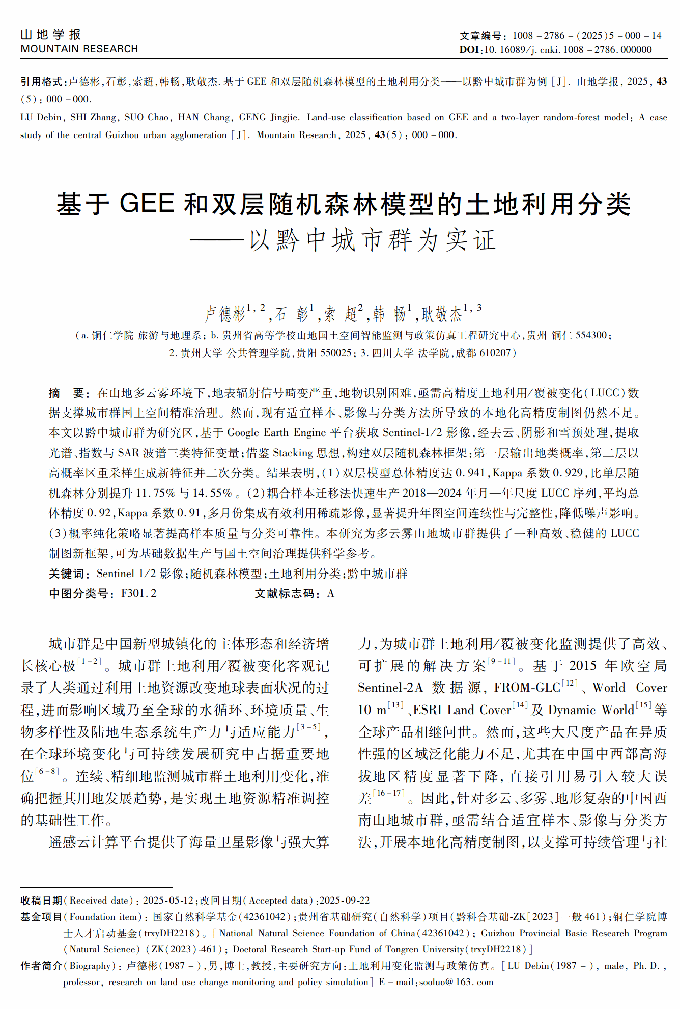 (3)瞄准西南地区多云、多雾和多雨山地土地利用遥感监测难题,基于Google earth engine遥感云计算平台,开发适合山地城市群复杂环境特征的双层随机森林模型新型土地利用分类框架,该框架通过数据堆叠技术,利用所有可用的稀疏影像数据,有效克服影像缺失与噪声干扰,并通过概率值纯化样本点的策略,极大提高了土地利用分类的精度和稳定性,为山地城市群土地利用高精度制图提供了新的科学工具。该成果以“基于GEE和双层随机森林模型的土地利用分类—以黔中城市群为实证”为题在《山地学报》(北大核心,中国山地科学研究领域唯一的权威期刊)发表,卢德彬教授为第一作者。