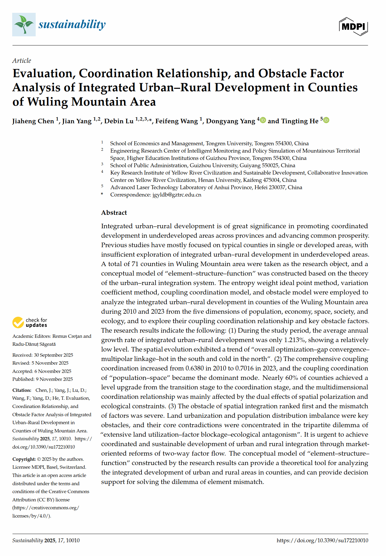 (1)以武陵山区为例,构建多维城乡融合评价模型,量化揭示了该区域发展缓慢、内部差异显著的空间格局,识别出“人口-空间”协同主导模式。研究指出,土地利用效率低、人口流动与生态承载力不匹配是制约城乡融合的核心障碍,为制定差异化政策提供了依据。该成果以“Evaluation, Coordination Relationship, and Obstacle Factor Analysis of Integrated Urban–Rural Development in Counties of Wuling Mountain Area”为题在《Sustainability》(SCI/SSCI双检索,JCR Q2分区)发表,我院2023级硕士研究生陈家恒为第一作者,卢德彬教授为通讯作者。