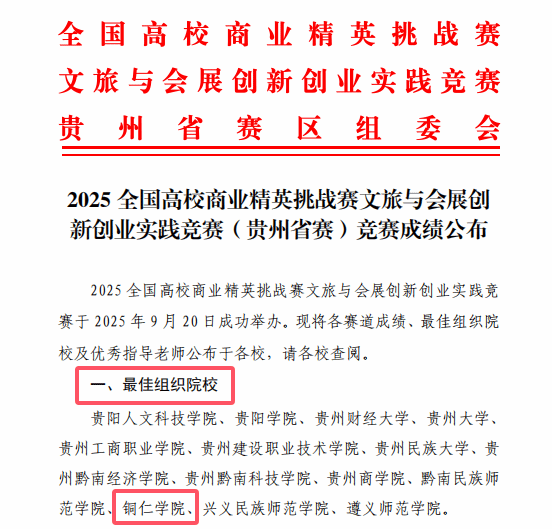 2025年9月20日,全国高校商业精英挑战赛文旅与会展创新创业实践竞赛(贵州省赛)线下赛在贵阳市贵州商学院成功举办。本次竞赛由省教育厅、省商务厅和省文化和旅游厅联袂指导,贵州省会展行业协会主办,贵州商学院承办,成功打造出了一场高水平的创新竞技赛。