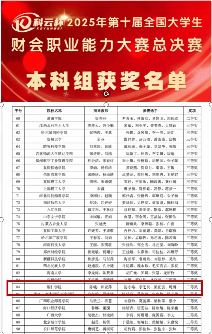 自今年10月启动校内选拔以来,我院代表队先后在贵州省赛中夺得冠军、季军、亚军等多项佳绩。此次在全国总决赛中再创佳绩,充分彰显了我院会计学专业扎实的教学质量与育人成效,也是学院持续深化教学改革、注重实践育人的生动体现。学院将以此为契机,进一步推进教学改革,完善“赛教融合”机制,不断提升人才培养质量,助力学生在专业道路上稳步前行,行稳致远。