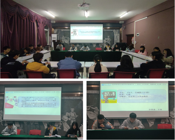 活动伊始,主持人讲述活动目的及活动要求,并指出此次活动的意义所在。读书会伴随着与会人员的掌声正式展开。第一位分享者戴巡枭同学给大家带来的书籍是《一言力》,她表达的观点是:讲话要学会说真正重要的部分,去掉一切浮夸无用的辞藻堆砌,将所想所欲之言精炼成“一言”,便能抓住“事物的本质”。紧接着,王凯同学分享了《每天一堂幽默口才课》,他以这本书教会大家如何面笑打败对手、巧妙处理突发状况以及合理应对尴尬等实用技巧。程惠琳同学分享了《关键对话:如何高效能沟通》,她通过举例面对不同对象主体时的交流方式来表达她的读后感悟,引起大家的共鸣与思考。余超英同学分享了《非暴力沟通》及读后感悟,交流通过转变谈话和聆听方式带来的改变。最后,龚经植同学分享了《做幽默人,说幽默话》,讲述如何用幽默去化解尴尬,与别人交流而展开沟通交流。在五位同学的生动介绍之后,同学们纷纷围绕“沟通与交流”的主题展开讨论和分享。
