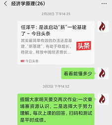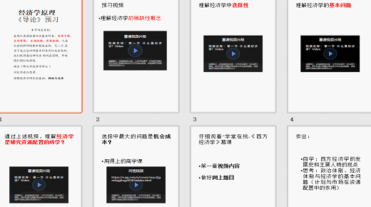 第一步“学生自学”。按照全学期教学进度表,编制每章节预习方案。老师对基本知识、原理在预习方案作出学习说明,上传雨课堂课程班级组。在预习里方案联接慕课复旦大学(中国前五大学)《经济学原理》,这个版本比我们学校讲得难度小,知识点更加清楚,容易入门。并在微信群发布附加学习材料。