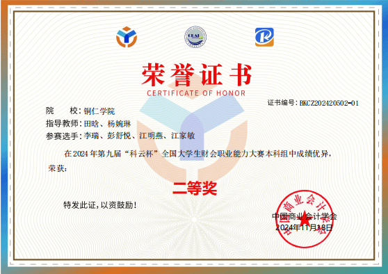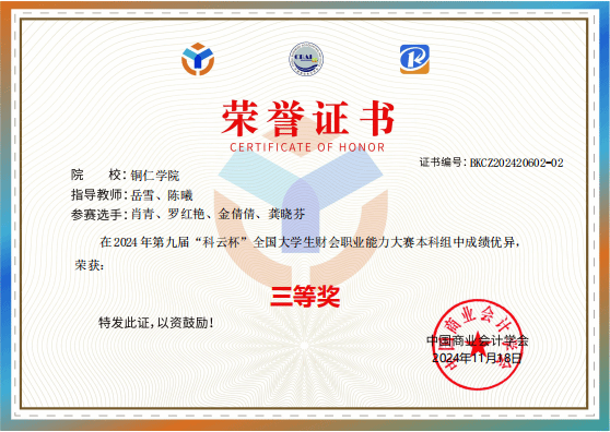 2024年10月13日第九届“科云杯”本科组财会职业能力大赛校赛阶段成功落下帷幕。我院经过一天的激烈角逐,最终有2支队伍脱颖而出,由李瑞、彭舒悦、江明燕、江家敏组建的铜仁1队(指导教师:田晗、杨婉琳),由龚晓芬、肖青、罗红艳、金倩倩组建的铜仁2队(指导教师:岳雪、陈曦)获得参加“科云杯”本科组财会职业能力大赛西部赛区选拔赛的资格。
