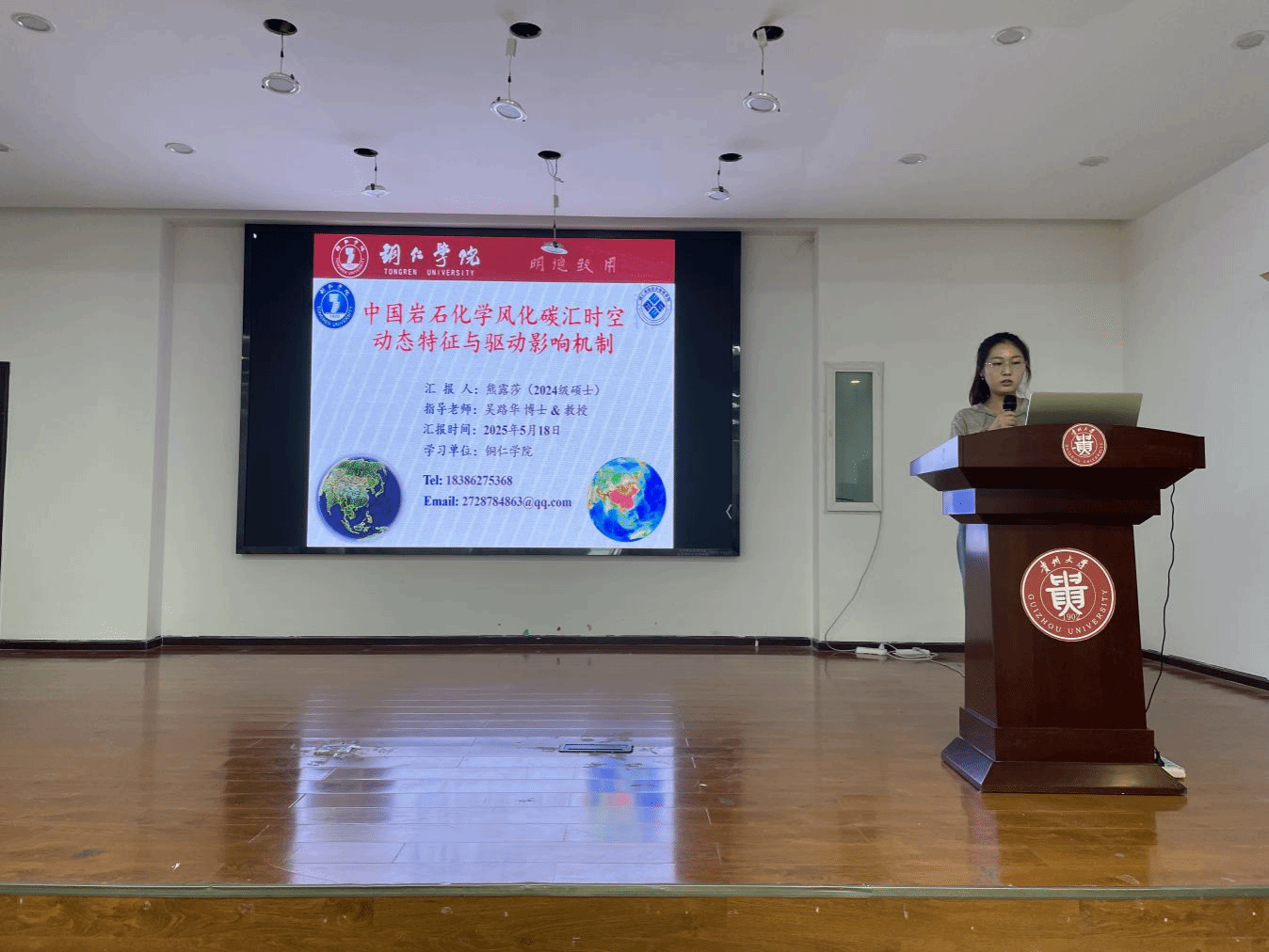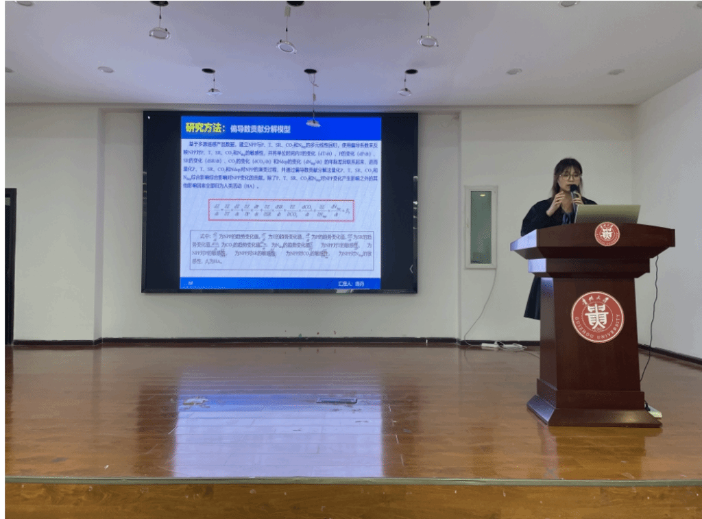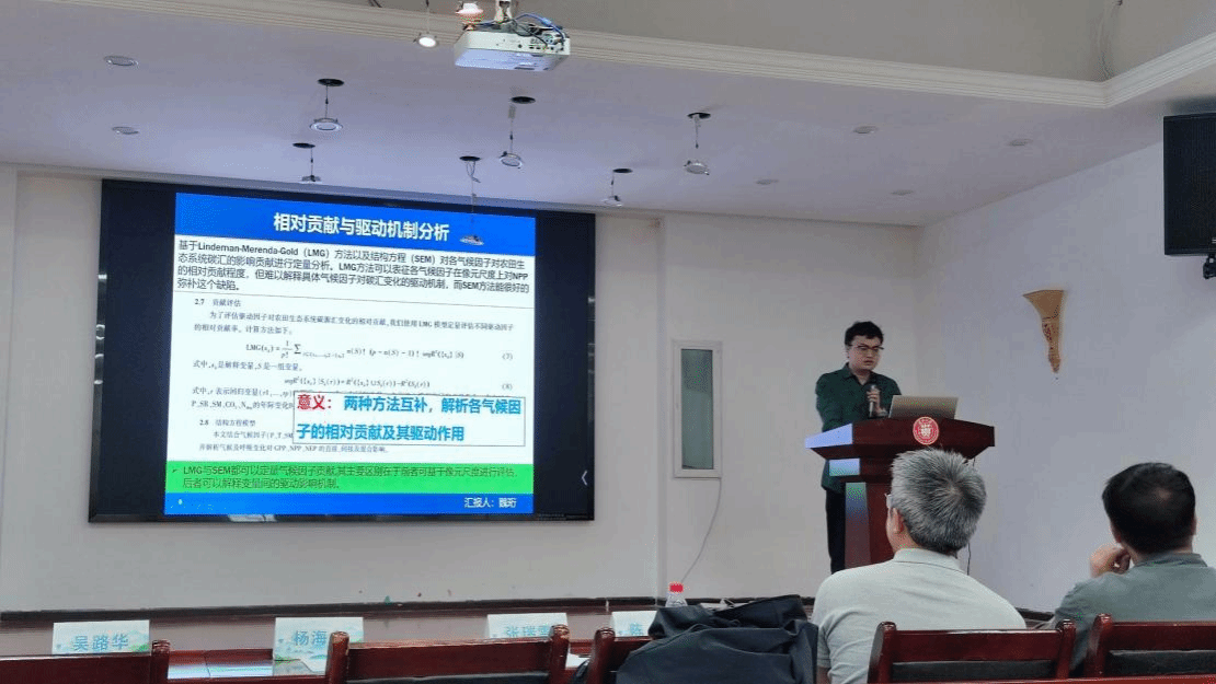 会上,魏珩、陈丹、熊露莎同学于分论坛作学术报告。魏珩同学以《气候变化下全球农田生态系统碳源汇演变特征》为题,基于多源遥感数据与模型模拟,揭示了全球农田碳汇对气候变化的响应特征,为农业碳中和策略优化提供了科学依据;陈丹同学在《气候变化主导中国植被碳汇增长而非人类活动》报告中,通过长序列遥感数据分析,提出气候变化对植被碳汇的驱动效应显著高于人为干预的结论,为生态政策制定提供了新视角;熊露莎同学聚焦地质碳汇前沿领域,在《中国岩石化学风化碳汇时空动态特征与驱动影响机制》报告中,揭示了中国岩石化学风化碳汇的量级规模、时空分布格局及气候变化因子对其贡献率。