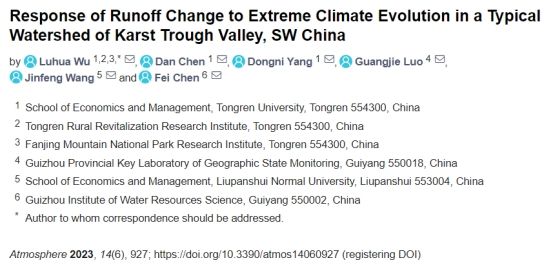 论文主要信息如下:Wu, L.; Chen, D.; Yang, D.; Luo, G.; Wang, J.; Chen, F. Response of Runoff Change to Extreme Climate Evolution in a Typical Watershed of Karst Trough Valley, SW China. Atmosphere 2023, 14(6), 927:1-20. https://doi.org/10.3390/atmos14060927.