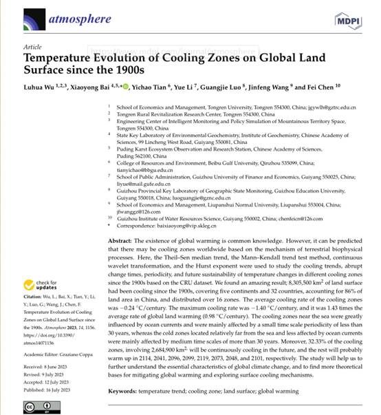 2023年7月,我院吴路华博士以第一作者在国际SCI期刊《Atmosphere》上,在线发表题为《Temperature evolution of cooling zones on global land surface since the 1900s》的学术论文(2023, 14(7), 1156:1-27;IF=3.11),揭示了百年以来变暖背景下全球陆地表面的变冷现象。