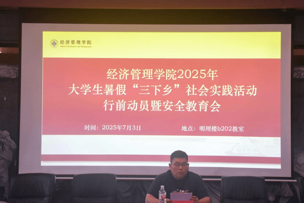 为贯彻落实2025年暑假社会实践活动工作要求,引导青年学子服务基层发展,增强社会实践能力与安全防范意识,2025年7月3日,经济管理学院于明理楼B202教室召开2025年大学生暑期“三下乡”社会实践活动行前动员暨安全教育会,会议由经济管理学院学生科科长唐鸿主持。