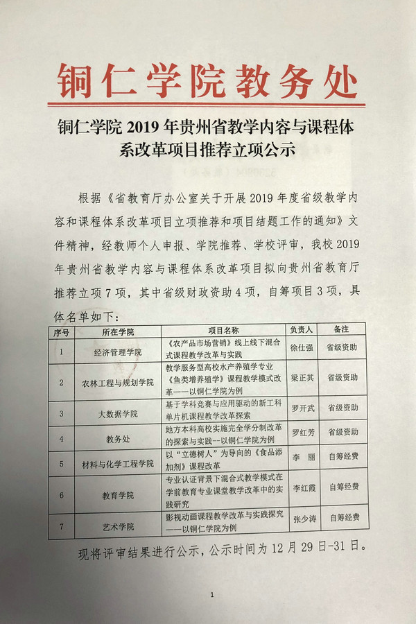 【教学项目】beat365英国官方网站2019年贵州省教学内容与课程体系改革项目推荐立项公示