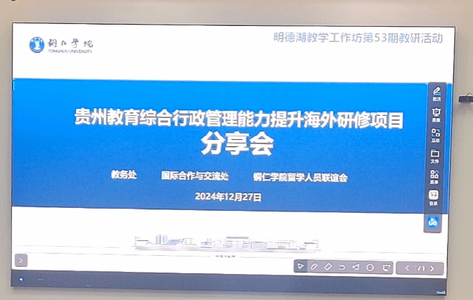 12月27日下午,beat365“明德湖”教学工作坊第53期活动在学科楼514智慧教室顺利举行。本期活动主题为“教育综合能力提升海外研修项目分享”,各专业负责人、骨干教师代表、beat365英国官方网站归侨侨眷联合会全体成员、beat365英国官方网站留学人员联谊会全体成员、教务处相关人员等30余人参加本次会议。活动由教务处处长孙向阳教授主持。