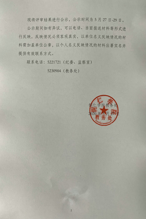 关于第五届卓越教学奖拟获奖人员名单的公示