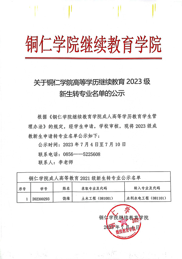 关于beat365英国官方网站高等学历继续教育2023级新生转专业名单的公示