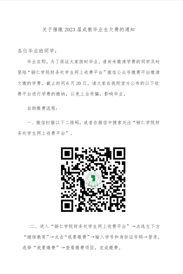 关于催缴2023届成教毕业生欠费的通知